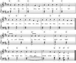 Backe, backe Kuchen is a popular German language children's rhyme. The original was in Saxony and Thuringia with several textual versions from 1840. It follows iambic pentameter with the melody.